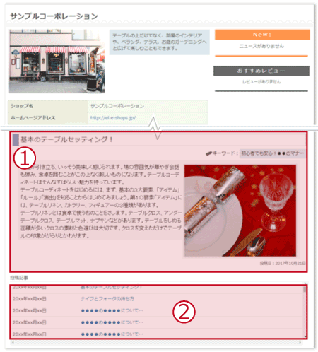 ①:こちらのエリアに設定されるリンクは「記事の詳細ページ(2-1)」が設定されます。